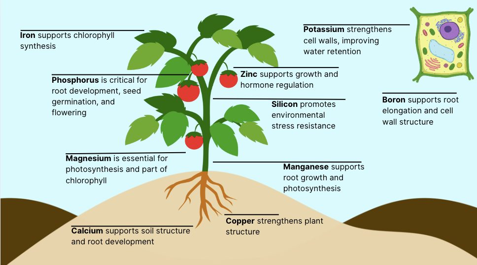 - Boron helps maintain soil nutrient balance and supports cell wall formation, influencing root elongation and structural integrity.