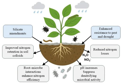 Nitrogen efficiency and resilience. Illustration of how silicate amendments enhance nitrogen retention, reduce N₂O emissions, and strengthen plant–microbe interactions. Source: Palma et al. (2025).