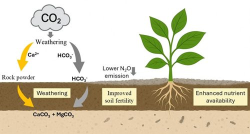 Carbon sequestration pathway. Conceptual model showing how silicate rock dust captures atmospheric CO₂ through mineral weathering, forming carbonates while improving soil fertility. Source: Palma et al. (2025).