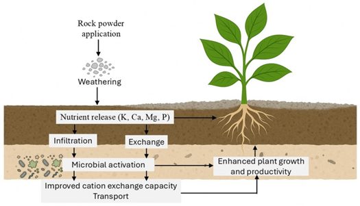 Soil remineralization overview. Conceptual diagram of soil remineralization. Weathering of applied rock powder gradually releases nutrients that enhance soil structure, microbial activity, and plant growth. Source: Palma et al. (2025).