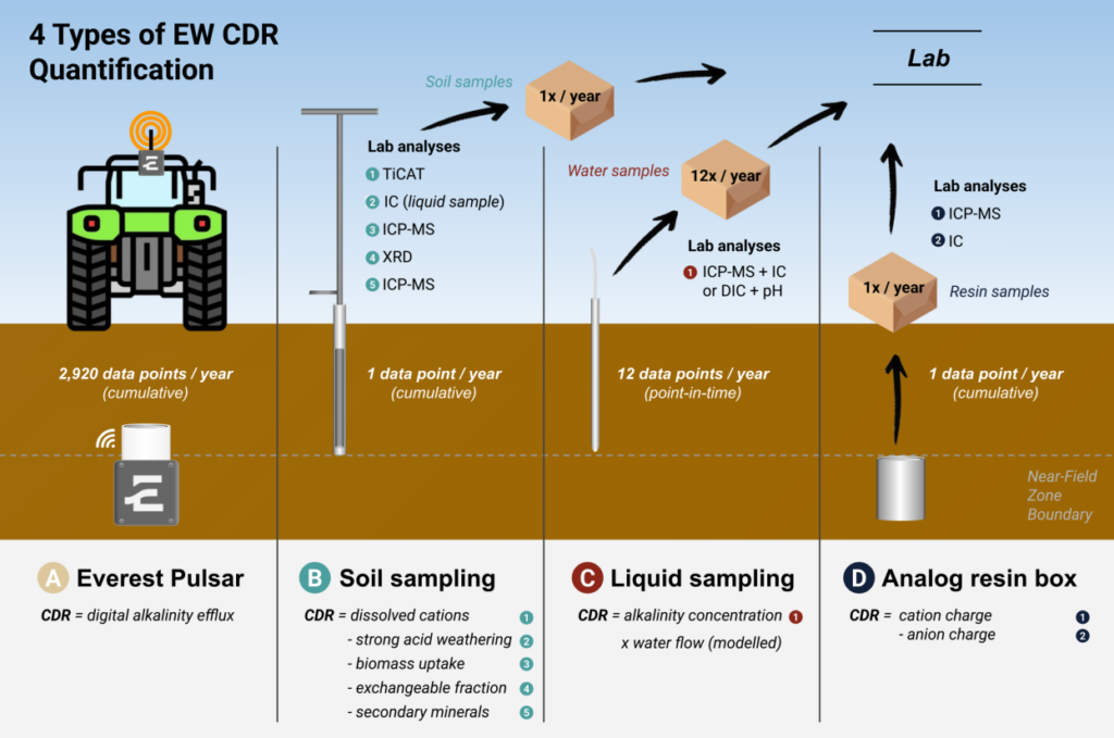 One method for quantifying sequestered carbon is by measuring total alkalinity. Because the carbonate travels some distance via water channels, the levels of alkalinity in any given location are constantly changing. Traditional methods of soil sampling test one data point at a single moment in time, meaning that each sample is reflective of the water passing through that data point at that specific moment of sampling. Because water moves through soil over time, any sample can be vastly different from another taken minutes or hours later. To effectively capture total alkalinity, measurement must be constant.