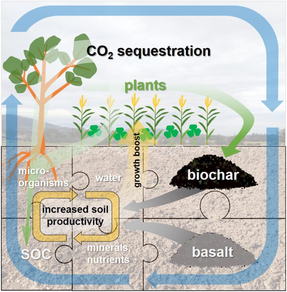 The authors outline a suite of land-based strategies designed to strengthen carbon capture and storage in agricultural landscapes. Practices such as cover cropping and agroforestry increase biomass inputs, while microbial and mineral interactions help stabilize soil organic carbon (SOC). Among these, two amendments stand out: biochar and basalt rock dust, whose combined effects may offer a scalable and enduring pathway for negative emissions.
